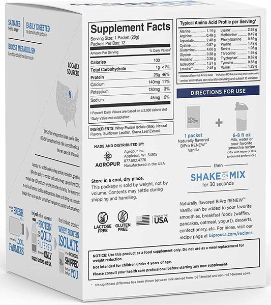 BiPro Renew 100% Whey Isolate Protein Powder, Dietician Recommended Dietary Supplement, Gluten Free, Vanilla, to-go Box (12 Single-Serve Packets)