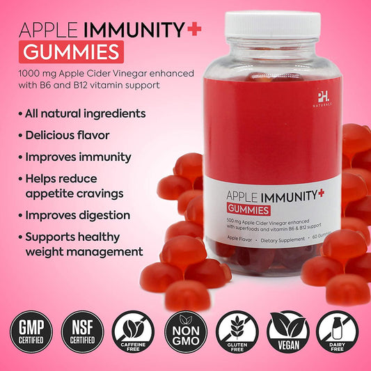 Apple Immunity Gummies - 1000mg - Enhanced with superfoods and Vita B6 and B12. Ideal for Gut Health and Digestive Support. All Natural.