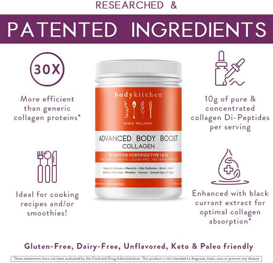 Body Kitchen - Advanced Body Boost, Collagen Peptides Powder (Type I, III) for Skin Hair Nail Joint, Hydrolyzed Collagen, Grass Fed, Dairy, Gluten Free, Unflavored, 30 Servings