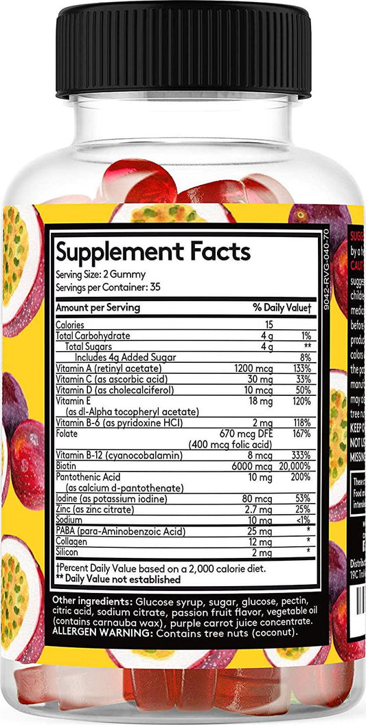 70 Hair Gummies Biotin 6000mcg Collagen Silicon PABA and Multivitamins | Hair Skin and Nails Vitamins Gummy for Women | B Complex Folic Acid 400mcg Vitamin A C D E and Zinc for Hair Growth | Pectin-Based