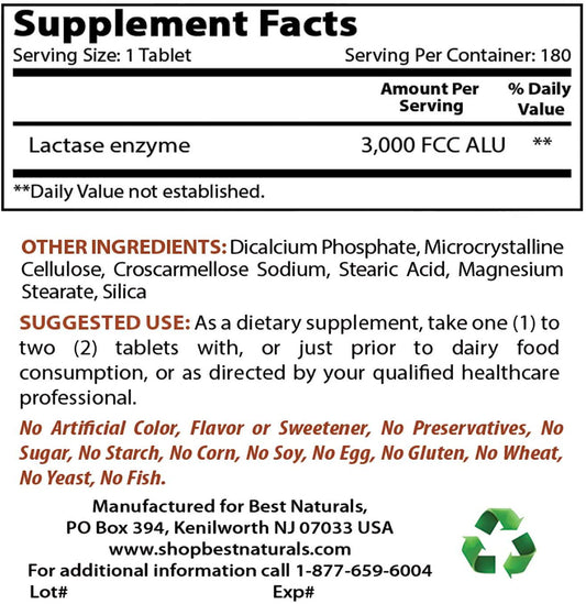 Best Naturals Fast Acting Lactase Enzyme Tablet, 3000 Fcc Alu, 180 Count (859375002900)