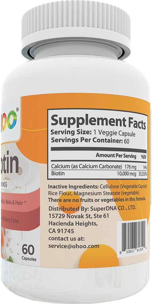 Biotin 10,000mcg | B Vitamin Supplement |Supports Stress Relief, Healthy Hair, Skin, Nail and Nervous System* | Calcium 176mg, Gluten Free 60 Capsules