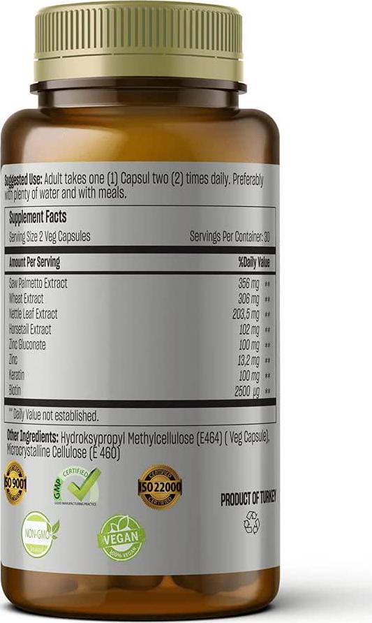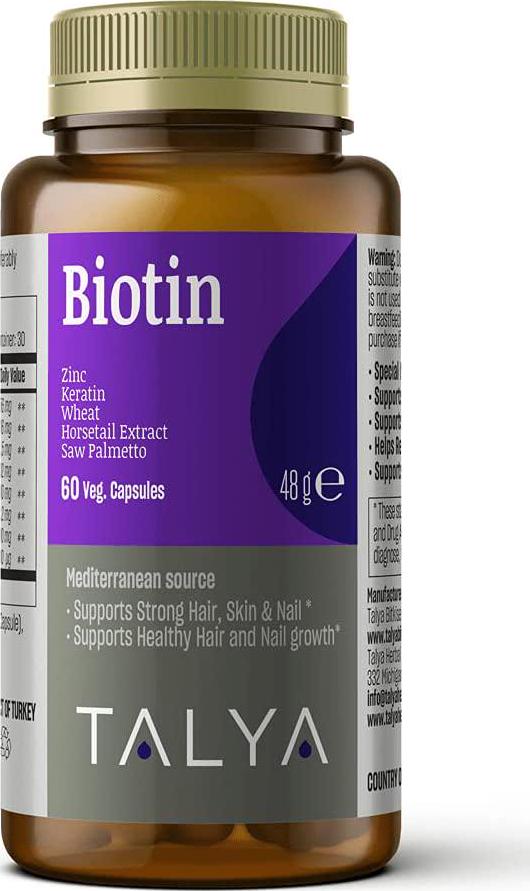 Biotin by Talya Herbal, Vitamin Supplement, Supports Metabolism for Energy and Healthy Hair, Skin, and Nails, Formulation Saw Palmetto Wheat Nettle Leaf Horsetail zinc Keratin 60 Capsules