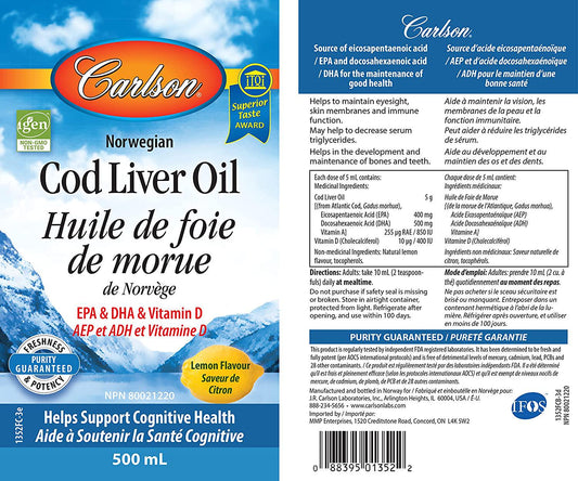 Carlson Labs Norwegian Natural Vitamin E Cod Liver Oil, Lemon, 500ml, Glass Bottle