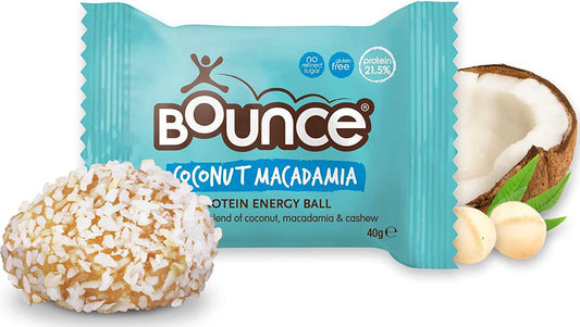 Bounce Coconut Macadamia Protein Ball- box of 12. High protein, gluten free, low sugar healthy snacks, better than any protein bar! Snack healthy with Bounce protein bars, balls, snacks and powders.