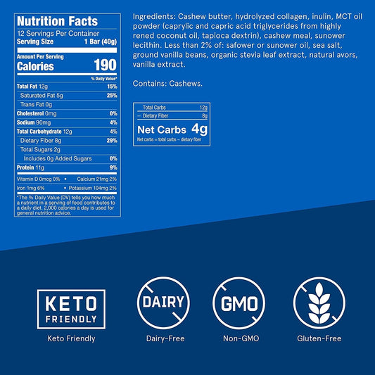 Collagen Protein Bars, Vanilla Shortbread, 11g Protein, 12 Pack, Bulletproof Grass Fed Healthy Snacks, Made with MCT Oil, 2g Sugar, No Added Sugar