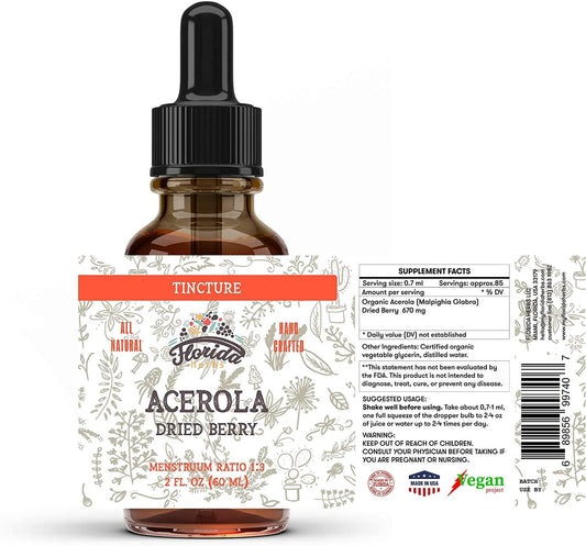 Acerola Tincture (Vitamin C), Organic Acerola Extract (Malpighia Glabra) Dried Berry for Blood, Heart, Arteries, Non-GMO in Cold-Pressed Organic Vegetable Glycerin, Florida Herbs Supplements