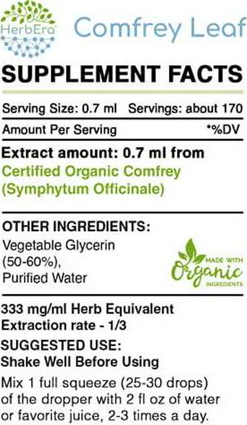 Comfrey Leaf B120 Alcohol-Free Herbal Extract Tincture, Organic Comfrey (Symphytum Officinale) Dried Leaf (4 fl oz)