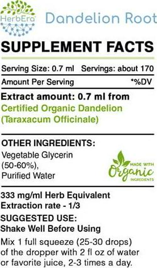 Dandelion Root Alcohol-Free Herbal Extract Tincture, Super-Concentrated Organic Dandelion (Taraxacum Officinale) Dried Root (4 fl oz)