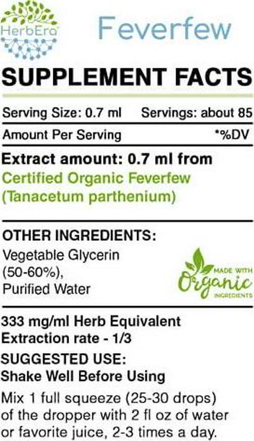 Feverfew B60 Alcohol-Free Herbal Extract Tincture, Super-Concentrated Organic Feverfew (Tanacetum parthenium) (2 fl oz)