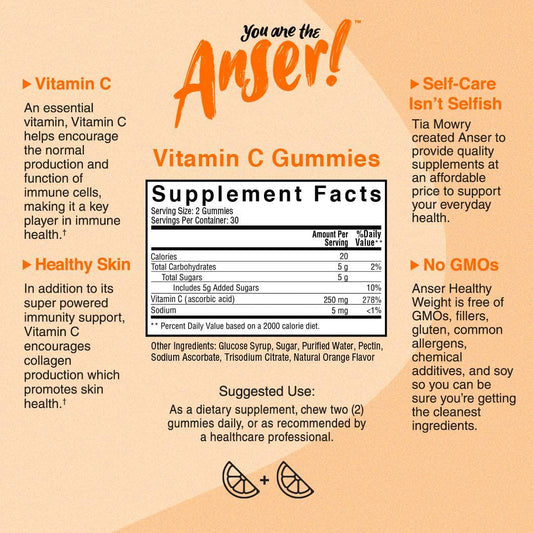 Anser Vitamin C Gummies for Adults - Supports Immune Defense with 250MG Per Serving -Natural Orange Flavor - Vegan, Gluten Free, No Artificial Ingredients - 30 Servings by Tia Mowry