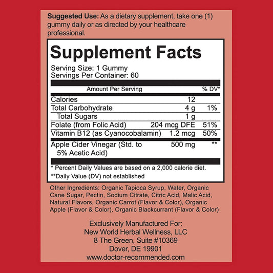 Apple Cider Vinegar Gummies with Vitamin B6, B12 and Folic Acid | for Cleansing, Metabolism, Energy Boost and Immunity Dietary Supplement | 60 ACV Gummies with The Mother