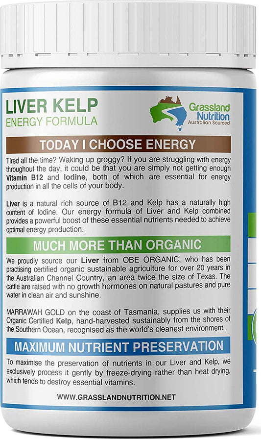 Grass Fed Beef Liver with Wild Harvested Kelp 100% Organically/Halal Sourced 2-IN-1 Energy Formula — Natural B12, Iodine, Iron and Vitamin A (180 Capsules)