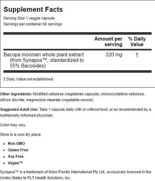 Doctor'S Best Bacopa with Synapsa, Non-Gmo, Vegan, Gluten Free, Soy Free, Helps Enhance Memory, 320 Mg, 60 Veggie Caps