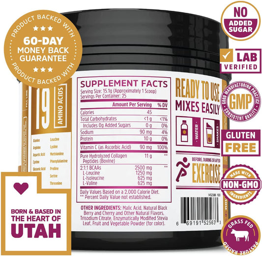 Collagen Active - Pure Hydrolyzed Collagen Peptides BCAA Powder with Vitamin C (13.3oz) - Supplement for Radiant Skin, Joint Flexibility, and Muscle Recovery