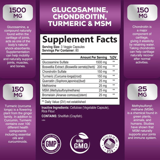 Glucosamine Chondroitin MSM Complex - Joint Support Supplement Turmeric & Boswellia, Triple Strength Glucosamine Capsules - Support for Joint Health & Mobility with Quercetin Bromelain - 240 Capsules