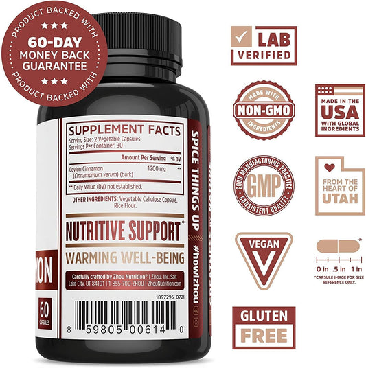 Ceylon Cinnamon Capsules - Designed to Support Blood Sugar, Heart Health and Joint Mobility - ‘ True Cinnamon ’ Native to Sri Lanka - 1200mg per serving