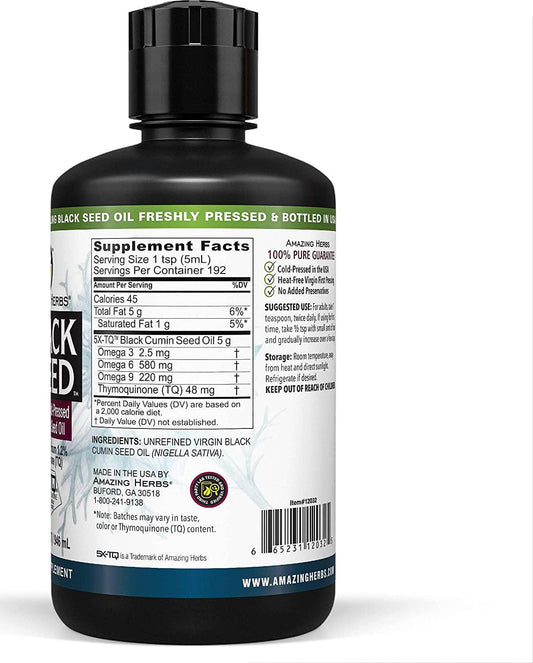 Amazing Herbs Premium Black Seed Oil - Cold Pressed Nigella Sativa Aids in Digestive Health, Immune Support, Brain Function, Joint Mobility, Gluten Free, Non GMO - 32 Fl Oz