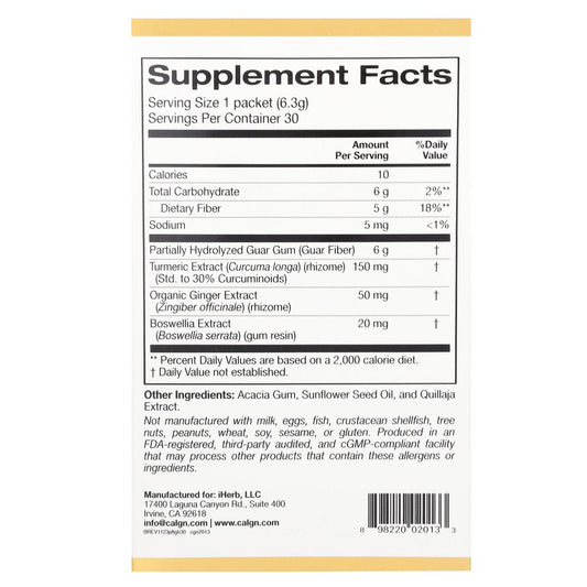 California Gold Nutrition Prebiotic Fiber plus Turmeric, Ginger, & Boswellia, 30 Packets, 0.22 Oz (6.3 G) Each