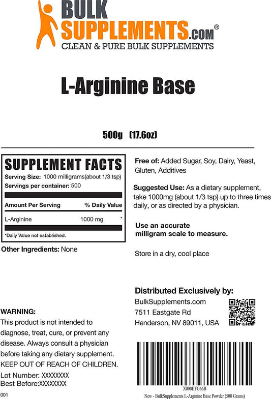 BulkSupplements.com L-Arginine Base - L Arginine Powder - Nitric Oxide Booster - Arginine Supplement - L-Arginine Nutritional Supplements - Nitric Oxide Supplements (500 Grams - 1.1 lbs)