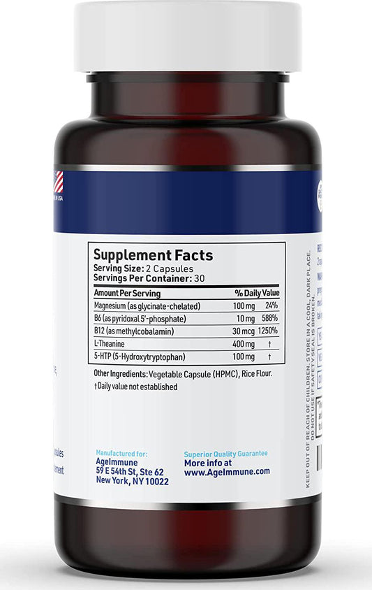 Anxiety Formula by AgeImmune; Anxiety Supplements Complex with L-Theanine, 5-HTP, Vitamins B6, B12 and Magnesium. Doctor Formulated, Magnesium Stearate Free. 60 Capsules.