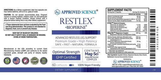 Approved Science Restlex - Natural Restless Leg Relief - 420 mg Magnesium Glycinate Blend, L-theanine 200 mg - 60 Vegan Friendly Capsules
