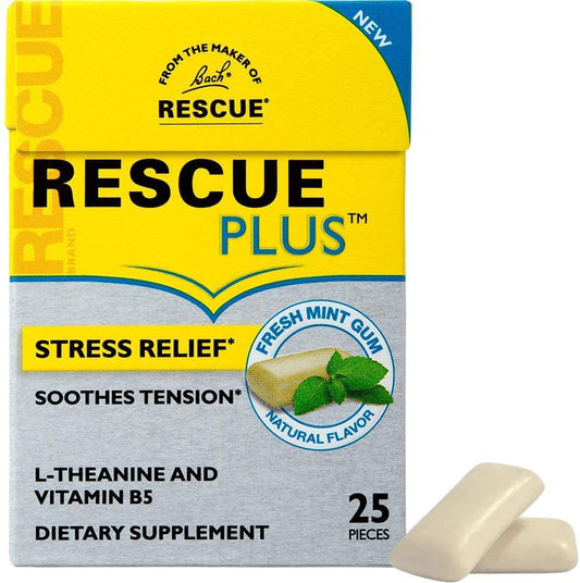 Bach RESCUE Plus Gum, Natural Mint Flavor, Stress and Tension Relief, L-Theanine and Vitamin B5 Dietary Supplement, Biodegradable Chicle Gum, No Artificial Sweeteners, Flavors, Colors, 10 Pack
