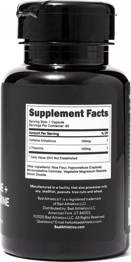 Bad Athletics Caffeine 100mg + L-Theanine 100mg Capsules | Focus and Energy | Nootropics Supplement | 60 Servings