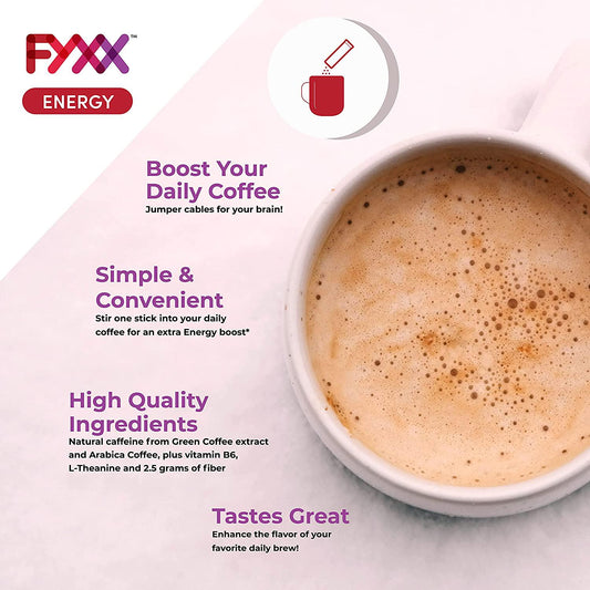 FYXX Energy Sticks add them to your coffee for an extra boost of energy and focus. Contains green coffee extract, fiber, vitamin B6, L-Theanine and an extra shot of arabica coffee. 14 Servings.