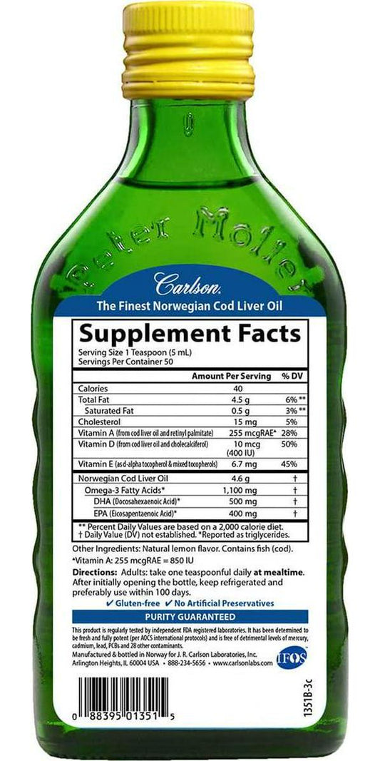 Carlson - Cod Liver Oil, 1100 mg Omega-3s, Liquid Fish Oil Supplement, Wild-Caught Norwegian Arctic Cod-Liver Oil, Sustainably Sourced Nordic Fish Oil Liquid, Lemon, 250 ml