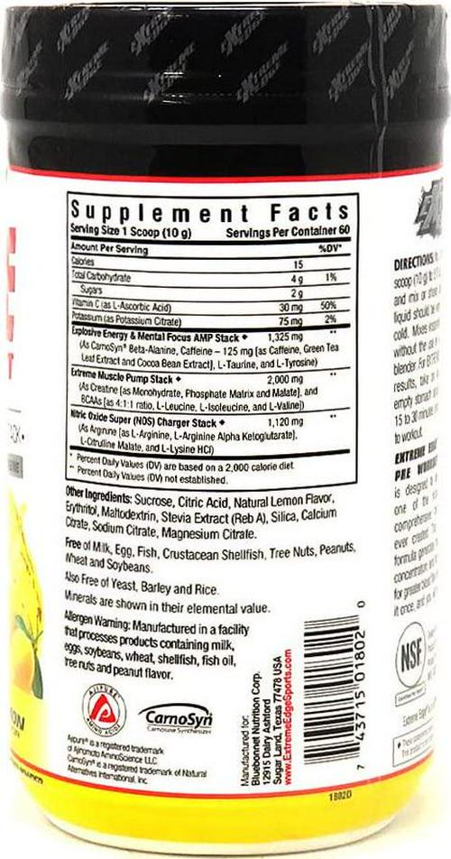 Bluebonnet Nutrition Extreme Edge Pre workout, Muscle Recharging Formula*, Increases Nitric Oxide (NO) levels*, Soy-Free, Dairy-Free, Lemon, 1.32 LB, 60 Servings