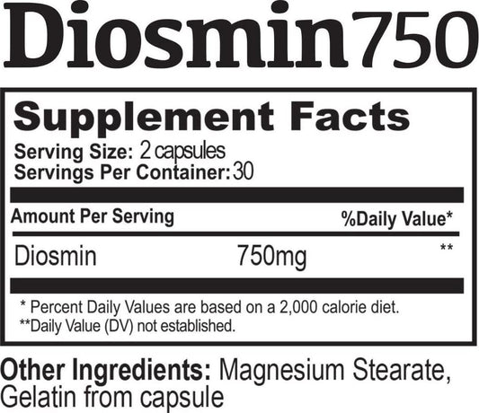 DIOSMIN 750mg Circulation and Vein Support (60 Capsules Bottle) Pure Diosmin not Mixes.