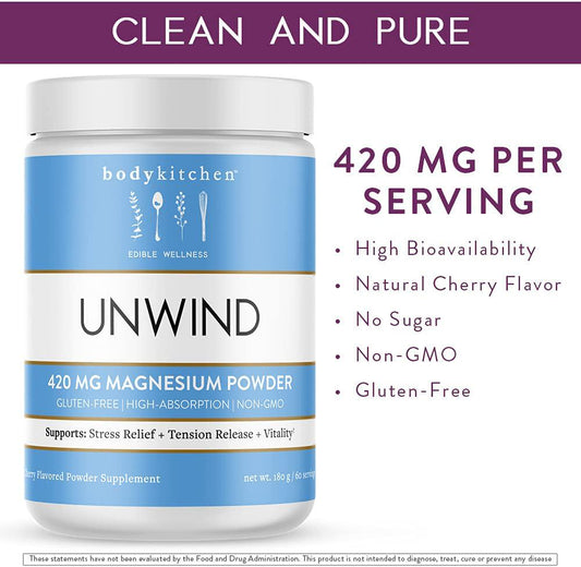 Body Kitchen - Unwind, Dimagnesium Malate, Magnesium Bisglycinate 420mg, Anti-Stress Magnesium Supplement Drink Mix Powder - Cherry, Vegan, Gluten Free and Non-GMO, 60 Servings