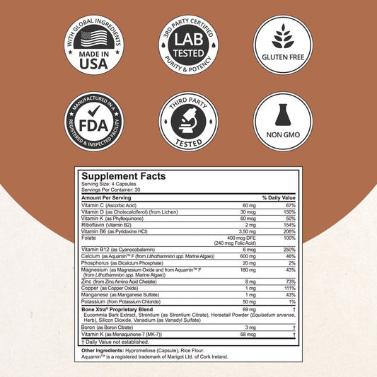 Bone Density Support Vitamin Supplements for Women and Men. Strong Bones Calcium Joint Health Complex w Magnesium Potassium D-3 K-1 C Copper Zinc Manganese Ipriflavone Boron Lysine Bromelain