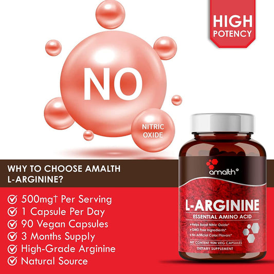Amalth L Arginine Male Enhancing Supplement from Nitric Oxide 500mg Extra Strength, 90 Veg Capsules