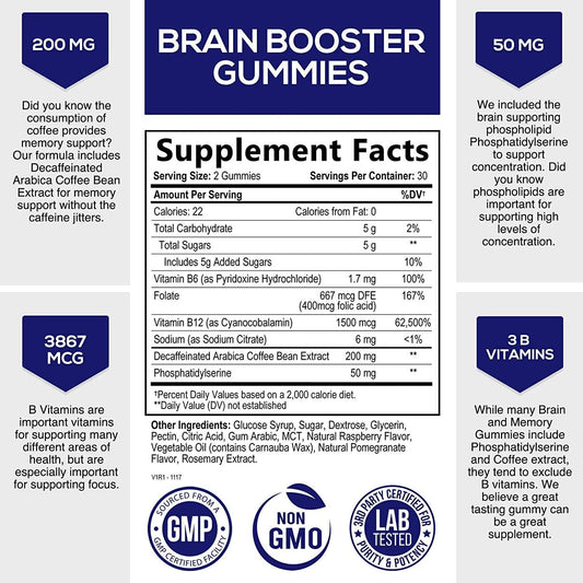 Brain Booster Gummies - Brain Supplement with B12 For Energy and Clarity - Support Focus and Support Memory - Brain Supplement For Concentration, Brain Fog, and Cognition - Vegan, Non-GMO - 60 Gummies