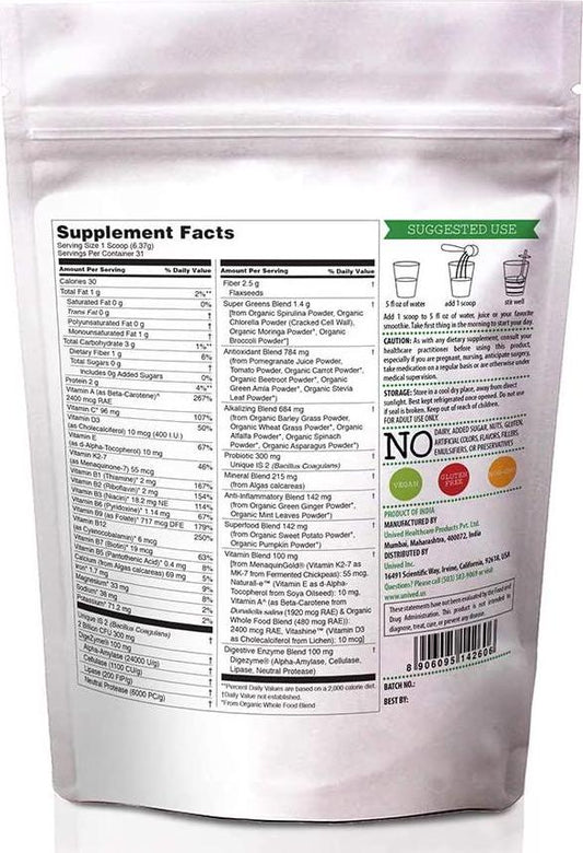 Daily Supergreens Powder, Plant-Based Superfood Blend of 20 Vital Nutrients, 2 Billion Probiotics, Digestive Enzymes, Iron and Fiber Rich, with Antioxidants, Vitamins and Minerals, Unflavored, 31 servings