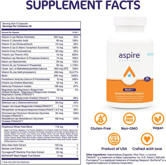 Aspire Multi+ Advanced Multivitamin for Men, Women and Kids (Flavored Capsule) - Best Supplement for Focus, Attention, Memory, Mood. More Absorbent Nutrients, Minerals and Vitamins - All Natural