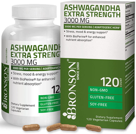 Bronson Ashwagandha Extra Strength 3000 mg per Serving, Stress and Mood Support with BioPerine - Non GMO, 120 Vegetarian Capsules