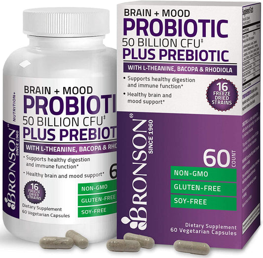 Bronson Brain + Mood Probiotic 50 Billion CFU Plus Prebiotic with L-Theanine, Bacopa and Rhodiola Non-GMO, 60 Vegetarian Capsules