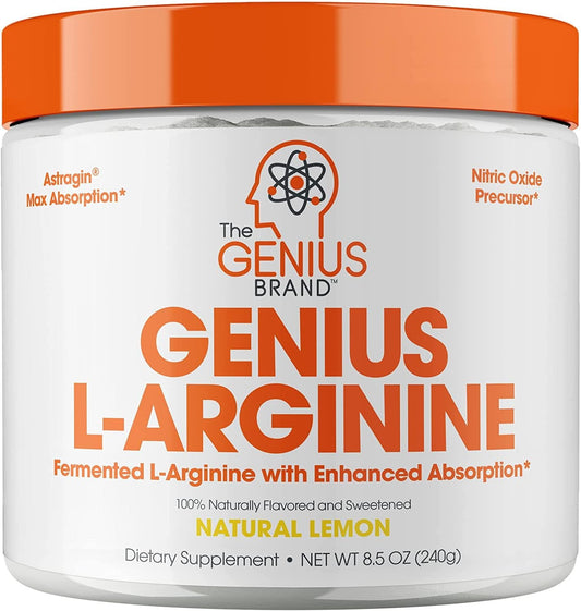 Genius L Arginine Powder - Fermented L-Arginine Nitric Oxide Supplement, Natural Muscle Builder and NO Booster for Healthy Blood Pressure, Protein Synthesis and Strength Building, Lemon, 30 Sv