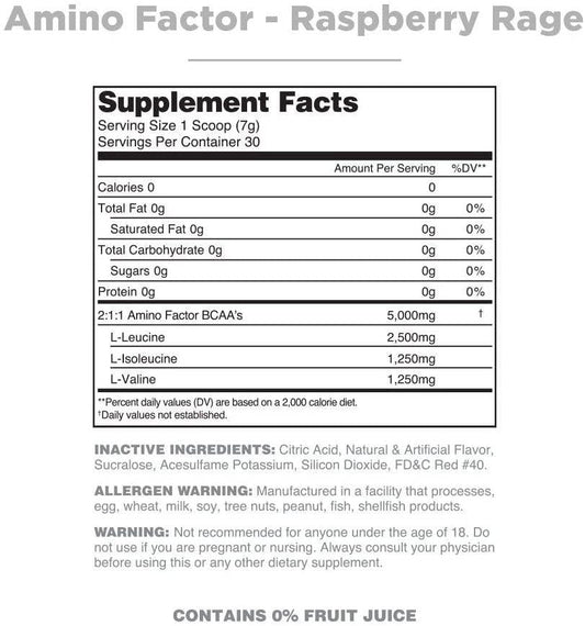 Amino Factor- Instantized 2:1:1 BCAA Supplement to Increase Muscle Protein Synthesis and Speed Recovery (Raspberry Rage, 30 Servings)