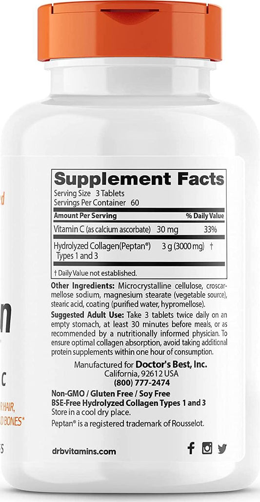Doctor's Best Collagen Types 1 and 3 with Peptan, Non-GMO, Gluten Free, Soy Free, Supports Hair, Skin, Nails, Tendons and Bones, 1000 mg, 180 Tablets