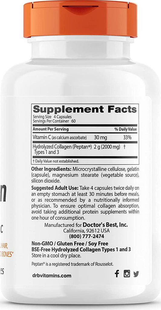 Doctor's Best Collagen Types 1 and 3 with Vitamin C, Non-GMO, Gluten Free, Soy Free, Supports Hair, Skin, Nails, Tendons and Bones, 500 mg, 240 Caps (DRB-00263)
