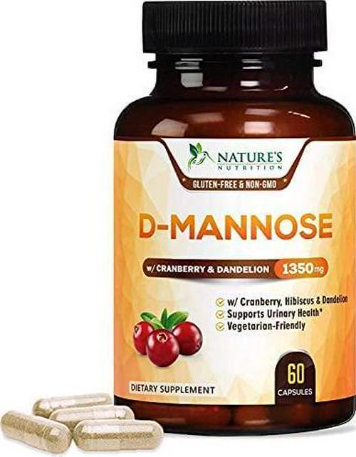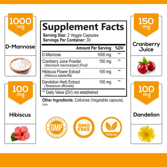 D-Mannose Capsules with Cranberry for UTI Support 1350mg - Extra Strength Urinary Tract Cleanse and Bladder Health, All-Natural Fast-Acting Pills w/Dandelion and Hibiscus - 60 Capsules