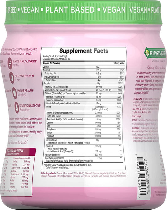 Complete Plant Protein and Vitamin Shake Mix by Nature's Bounty Optimal Solutions, with Fiber and Probiotics, Plant Based, Decadent Chocolate, 13 Oz