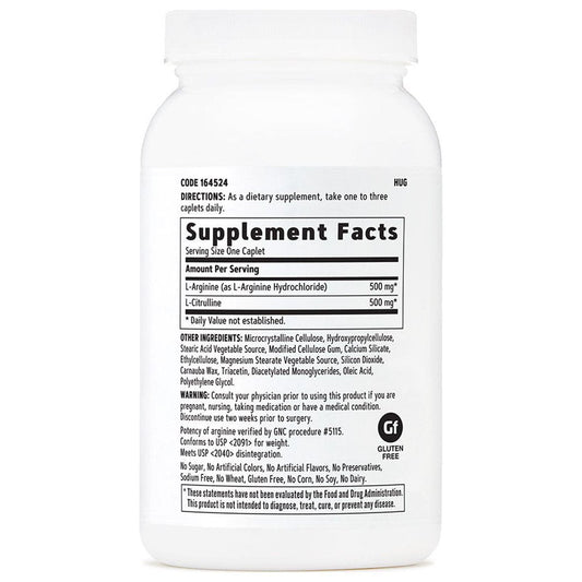 GNC L-Arginine and L-Citrulline 500mg/500mg, 120 Caplets, Increases Nitric Oxide Production