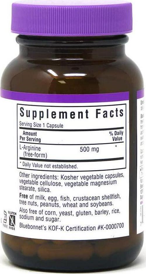 Bluebonnet Nutrition L-Arginine 500mg, Free-Form Amino Acid, Nitric Oxide Precursor, Soy-Free, Gluten-Free, Non-GMO, Kosher Certified, 50 Vegetable Capsules, 50 Servings