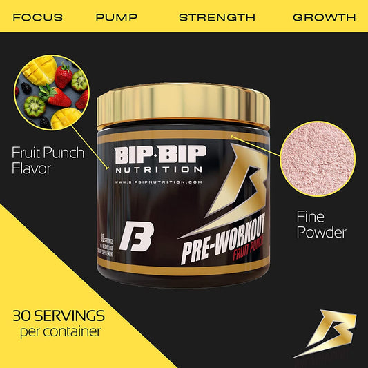 Bip Bip Nutrition Pre Workout Powder, NO CRASH! Fruit Punch 30 Servings, 300mg Caffeine, Beta Alanine, L-Citrulline, Increased Endurance and Focus, Energy Boost, Vegan, Keto Friendly