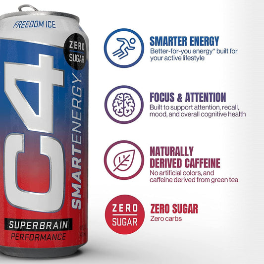C4 Smart Energy Drink - Sugar Free Performance Fuel and Nootropic Brain Booster, Coffee Substitute or Alternative | Freedom Ice 12 Oz - 12 Pack